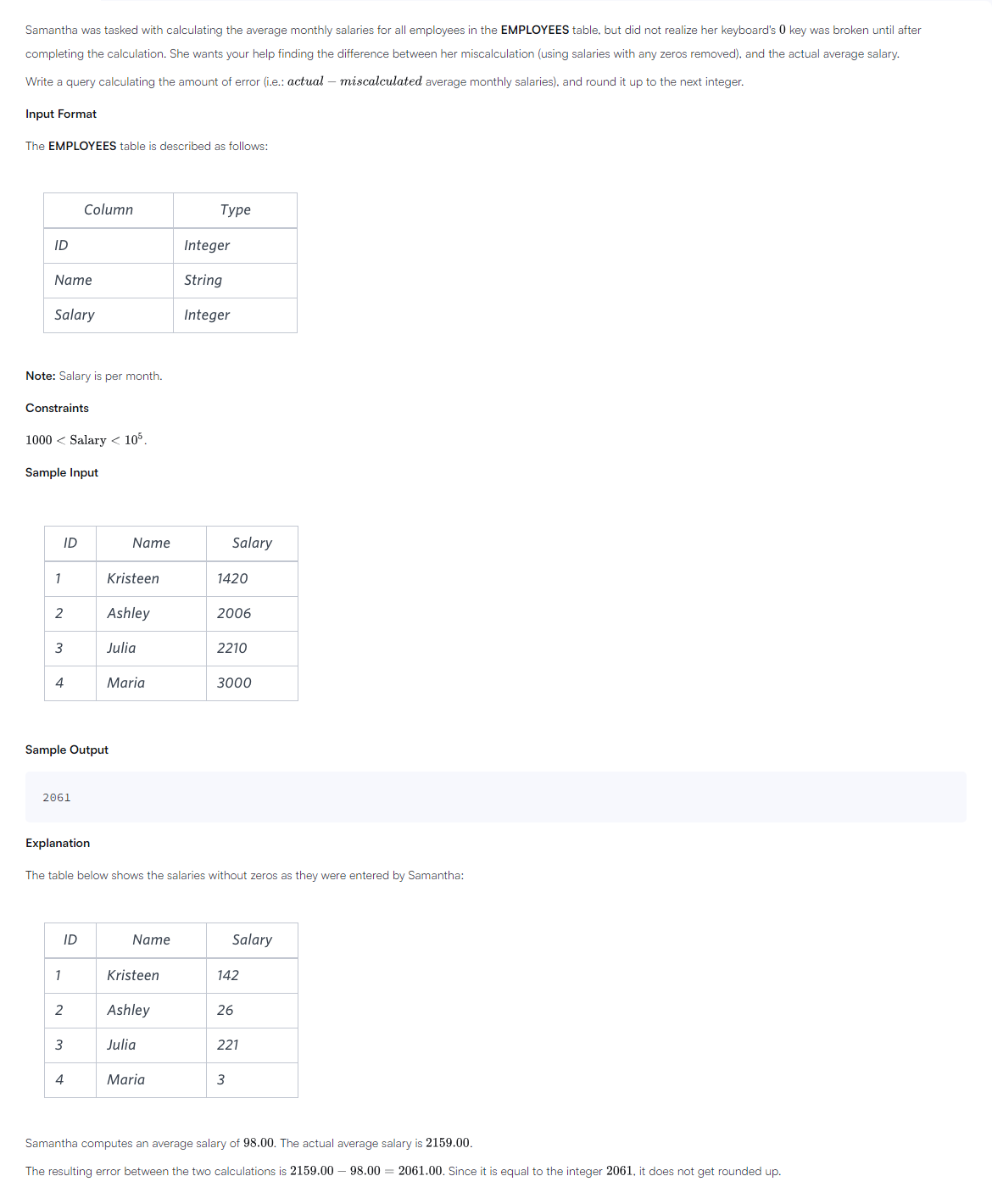 SELECT CEIL(AVG(Salary) - AVG(REPLACE(Salary, 0, ''))) AS Output