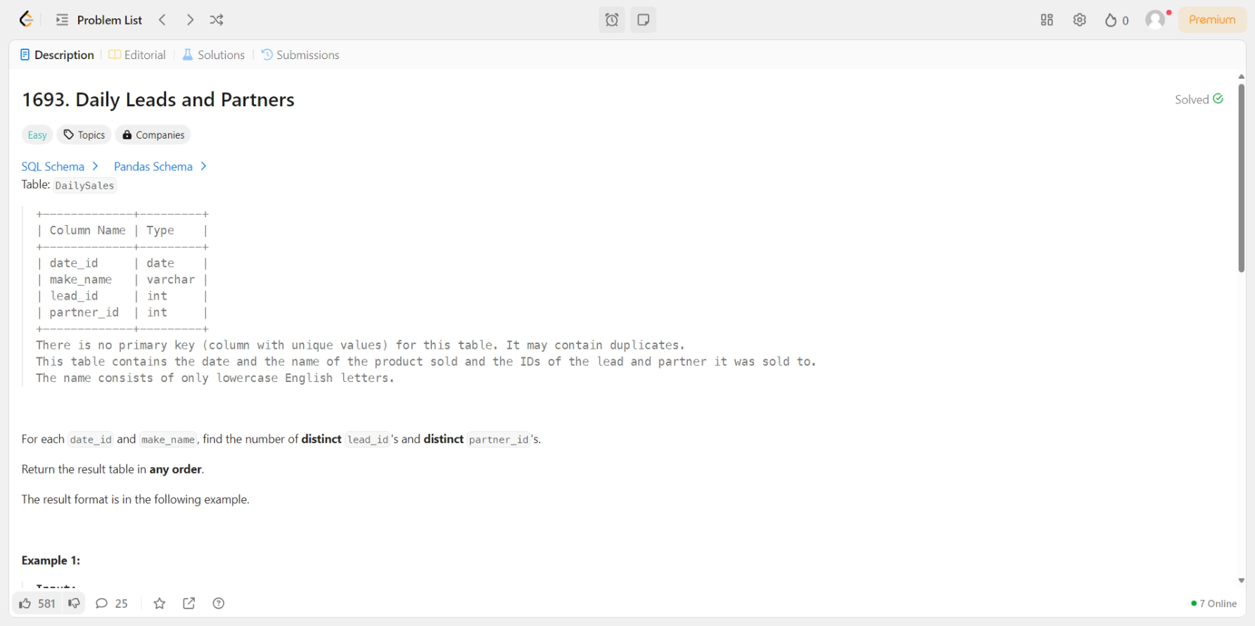 [문제] [MySQL]WITH Unique_leads AS ( SELECT date_id , make_name , COUNT(DISTINCT lead_id) AS unique_leads FROM DailySales GROUP BY date_id, make_name) , Unique_partners AS ( SELECT date_id , make_name , COUNT(DISTINCT partner_id) AS unique_partners FROM DailySales GROUP BY date_id, make_name)SELECT ul.* , up.unique_partnersFROM Unique_leads AS ul ..