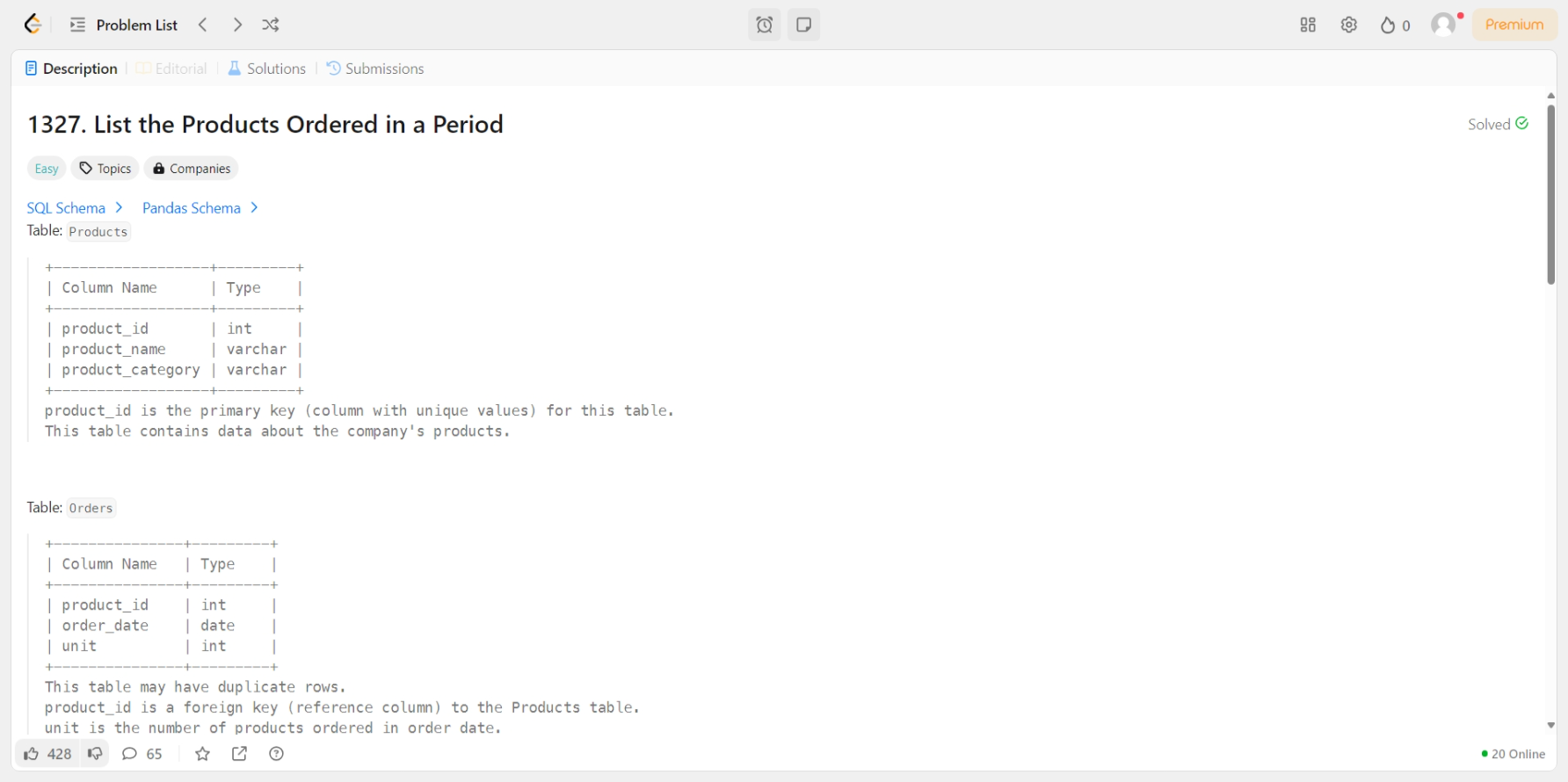 [LeetCode] 1327. List the Products Ordered in a Period [문제] [MySQL]SELECT p.product_name , SUM(o.unit) AS unitFROM Products AS p LEFT JOIN Orders AS o ON p.product_id = o.product_idWHERE o.order_date >= '2020-02-01' AND o.order_date = 100 SQL/LeetCode 2025.02.20