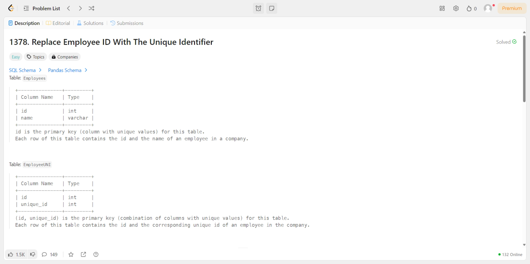 [LeetCode] 1378. Replace Employee ID With The Unique Identifier [문제] [MySQL]SELECT eu.unique_id , e.nameFROM Employees AS e LEFT JOIN EmployeeUNI AS eu ON e.id = eu.id SQL/LeetCode 2025.02.20