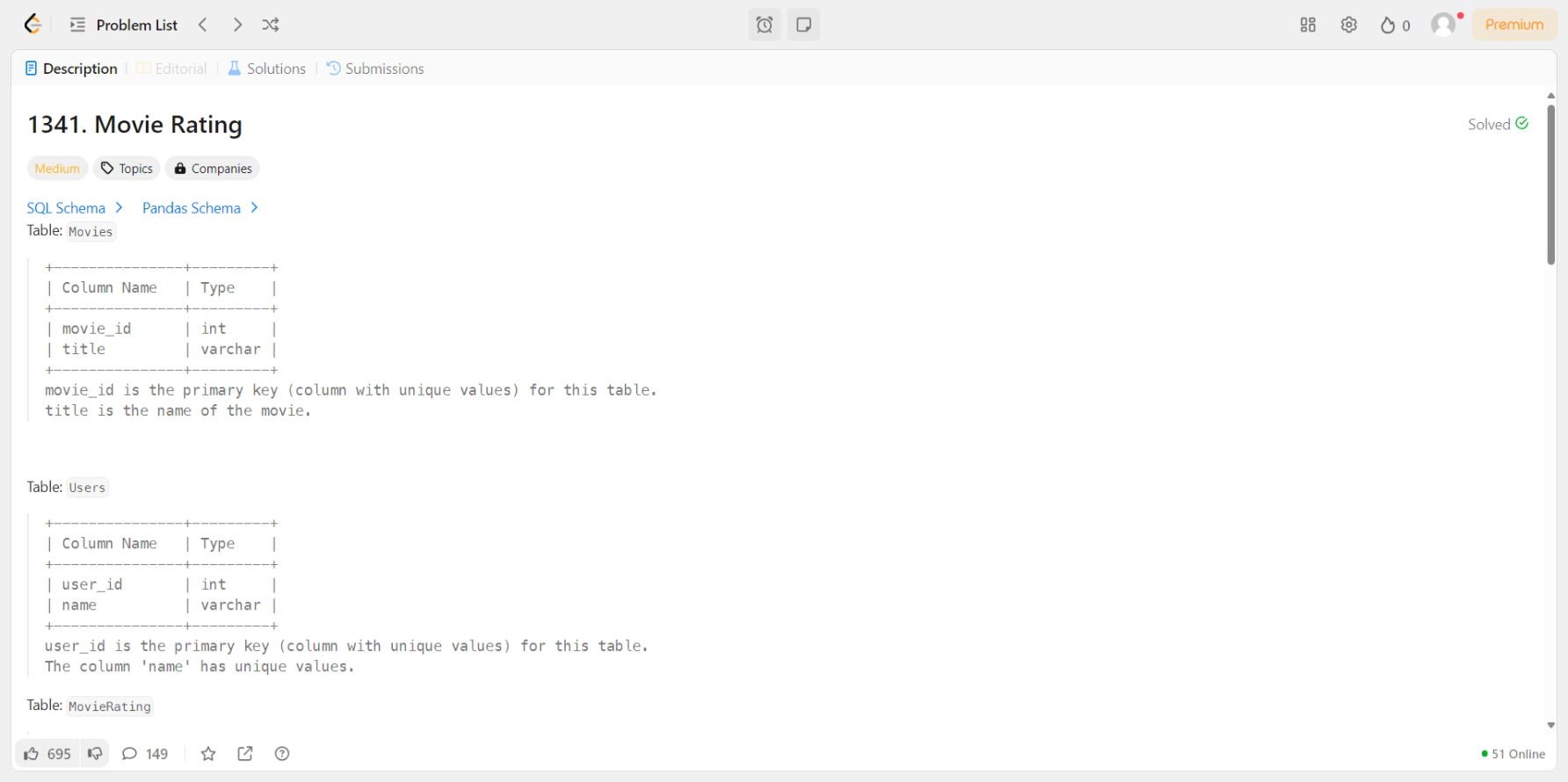 [LeetCode] 1341. Movie Rating [문제] [MySQL]WITH Rating AS ( SELECT m.* , u.* , mr.rating , mr.created_at FROM MovieRating AS mr LEFT JOIN Movies AS m ON mr.movie_id = m.movie_id LEFT JOIN Users AS u ON mr.user_id = u.user_id)(SELECT name AS resultsFROM RatingGROUP BY user_idORDER BY COUNT(*) DESC, name ASCLIMIT 1)UNION ALL(SELECT title AS resultsFROM RatingWHERE created_at >= '2020-02.. SQL/LeetCode 2025.02.20