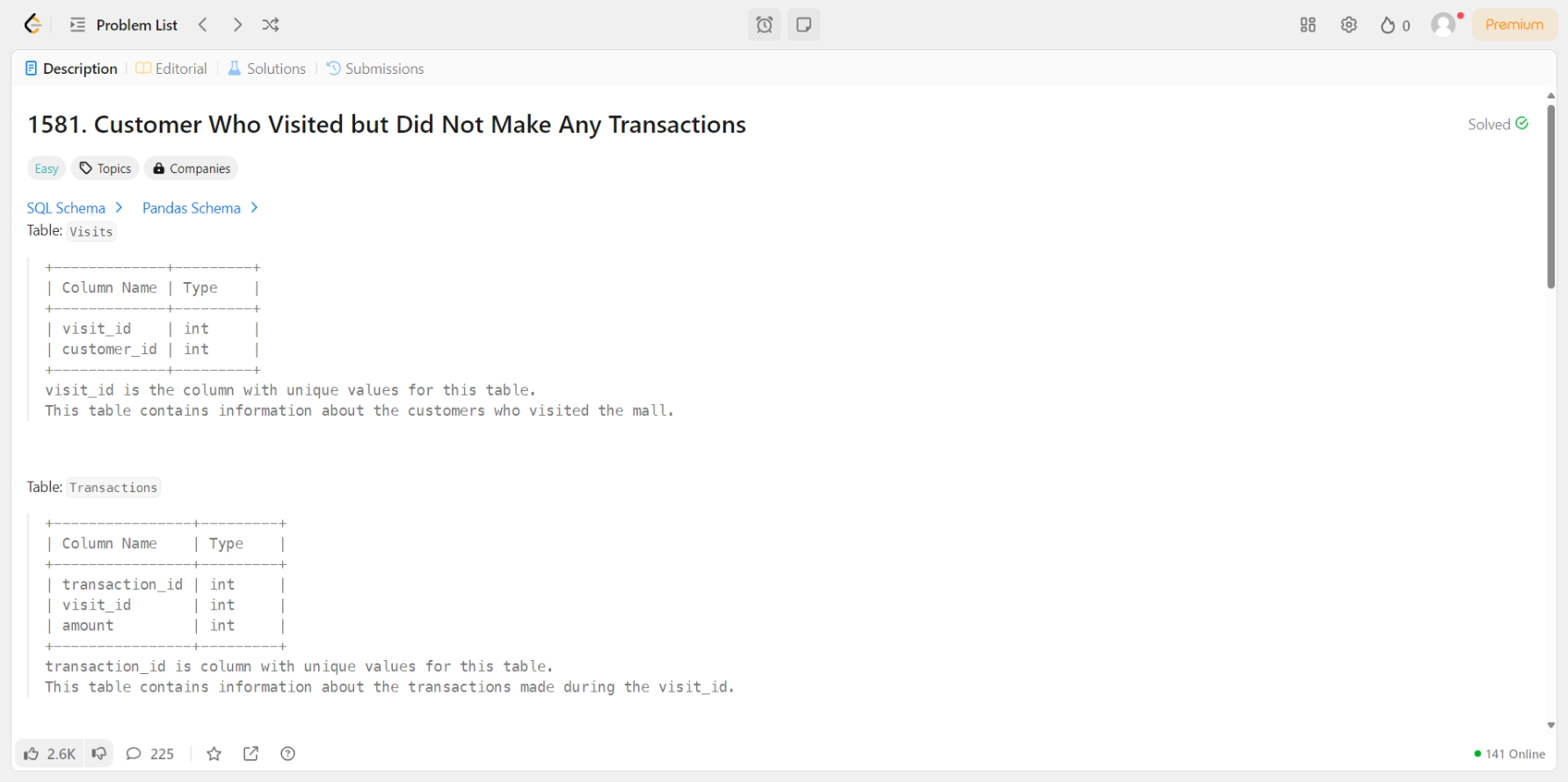 [LeetCode] 1581. Customer Who Visited but Did Not Make Any Transactions [문제] [MySQL]SELECT v.customer_id , COUNT(*) AS count_no_transFROM Visits AS v LEFT JOIN Transactions AS t ON v.visit_id = t.visit_idWHERE t.transaction_id IS NULLGROUP BY v.customer_id SQL/LeetCode 2025.02.20