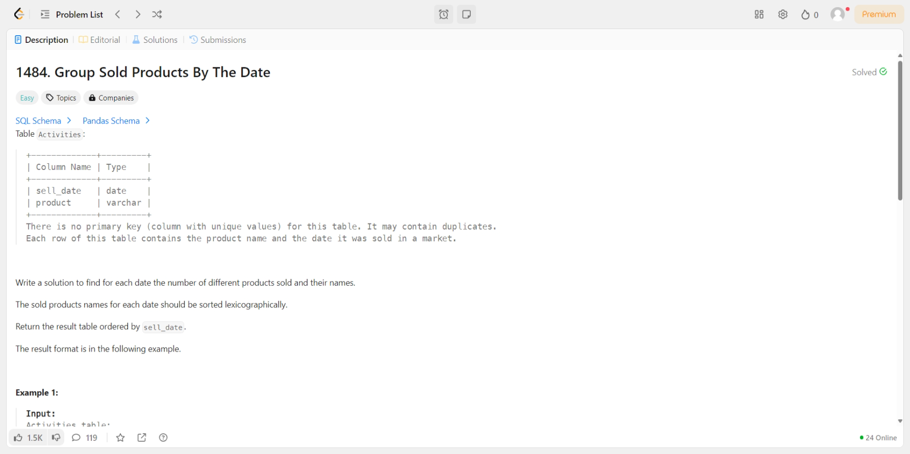 [LeetCode] 1484. Group Sold Products By The Date [문제] [MySQL]SELECT sell_date , COUNT(DISTINCT product) AS num_sold , GROUP_CONCAT(DISTINCT product ORDER BY product ASC) AS productsFROM ActivitiesGROUP BY sell_date SQL/LeetCode 2025.02.20