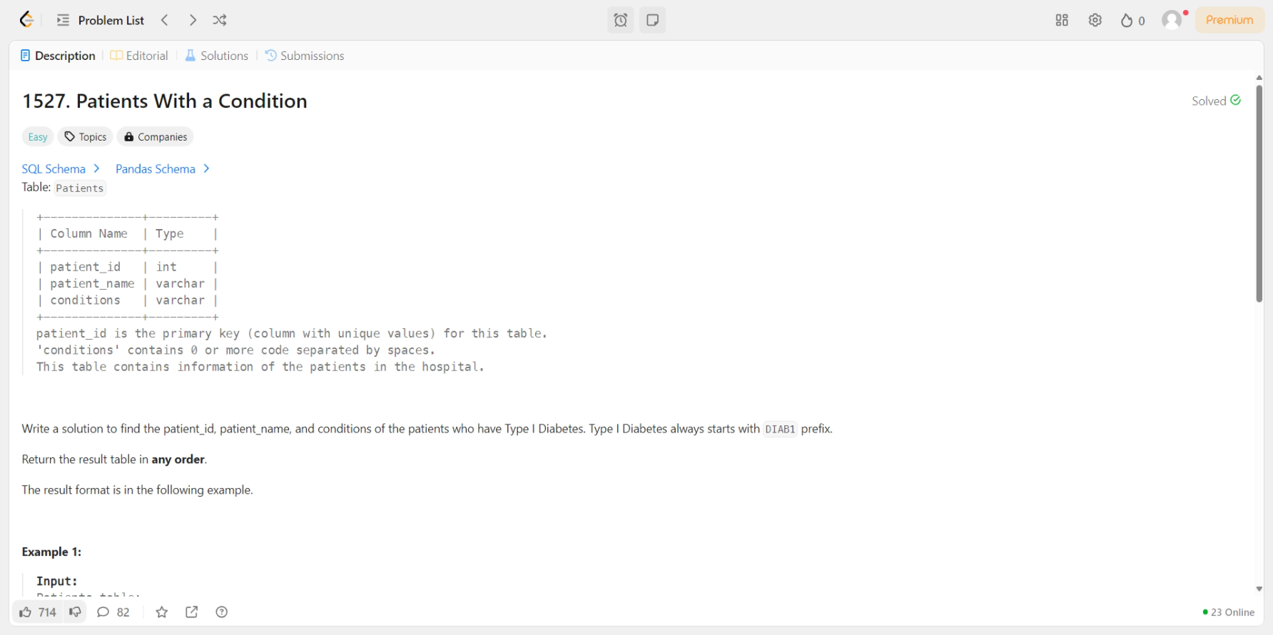 [LeetCode] 1527. Patients With a Condition [문제] [MySQL]SELECT *FROM PatientsWHERE conditions LIKE 'DIAB1%' OR conditions LIKE '% DIAB1%' SQL/LeetCode 2025.02.20