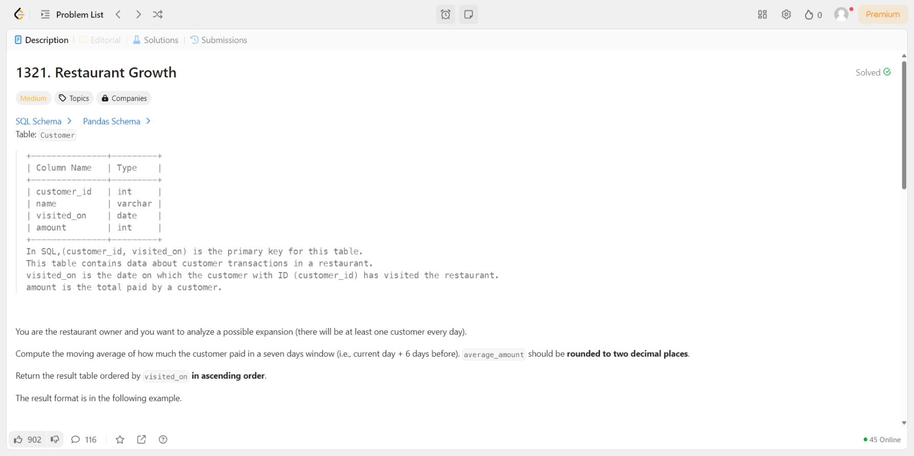 [LeetCode] 1321. Restaurant Growth [문제] [MySQL]WITH daily AS ( SELECT visited_on , SUM(amount) AS daily_amount FROM Customer GROUP BY visited_on), moving_amount AS ( SELECT visited_on , LAG(visited_on, 6) OVER (ORDER BY visited_on) AS first_date , SUM(daily_amount) OVER (ORDER BY visited_on ROWS BETWEEN 6 PRECEDING AND CURRENT ROW) AS amount , ROUND(AVG(dail.. SQL/LeetCode 2025.02.20