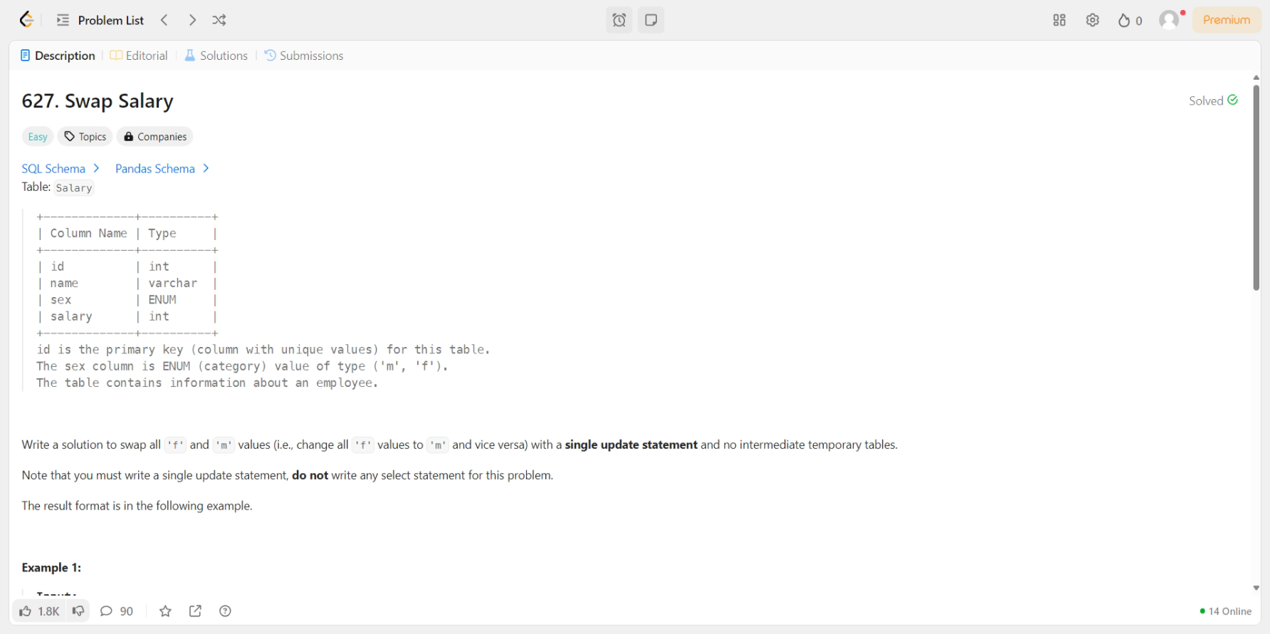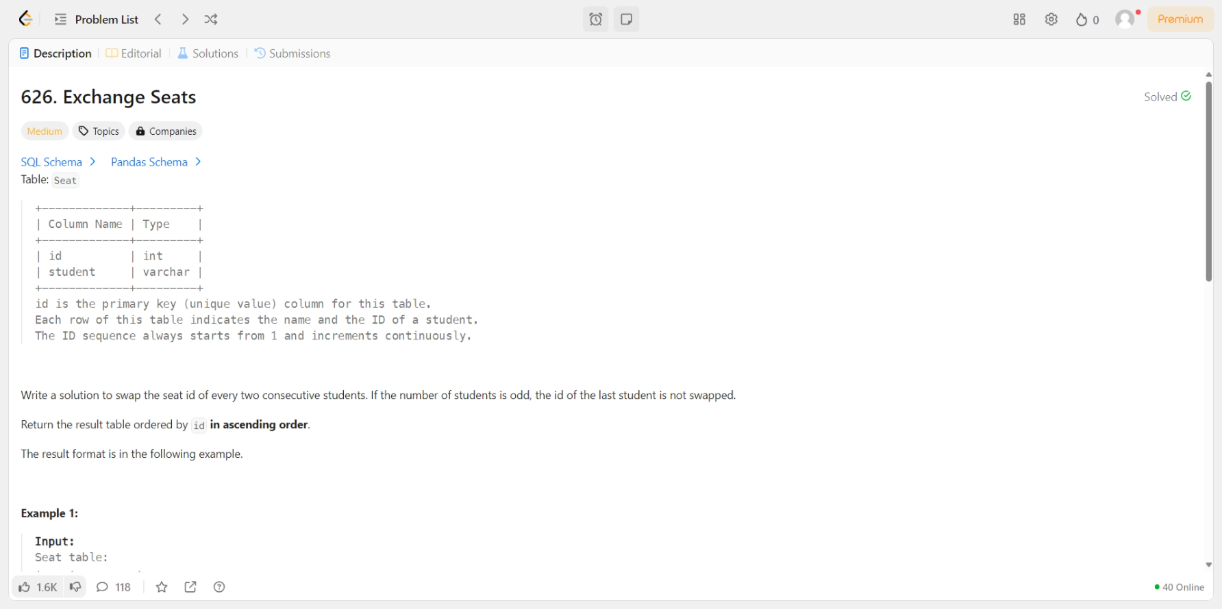 [문제] [MySQL]WITH id_row AS ( SELECT * , LAG(student, 1) OVER (ORDER BY id ASC) AS front_student , LEAD(student, 1) OVER (ORDER BY id ASC) AS back_student FROM Seat)SELECT id , CASE WHEN (MOD(id, 2) = 1 AND back_student IS NULL) THEN student WHEN MOD(id, 2) = 1 THEN back_student WHEN MOD(id, 2) = 0 THEN front_student END AS studentFROM id_row